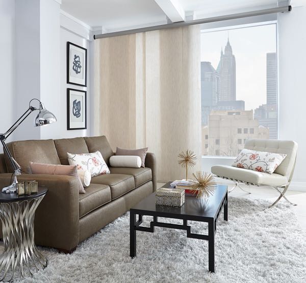 If you’re wanting to replace vertical blinds, then panel tracks (or panel track blinds) make the cut. They hang down from a rail like other vertical blinds, but move very easily and are more stylish due to their large fabric panels instead of thin blind slats.